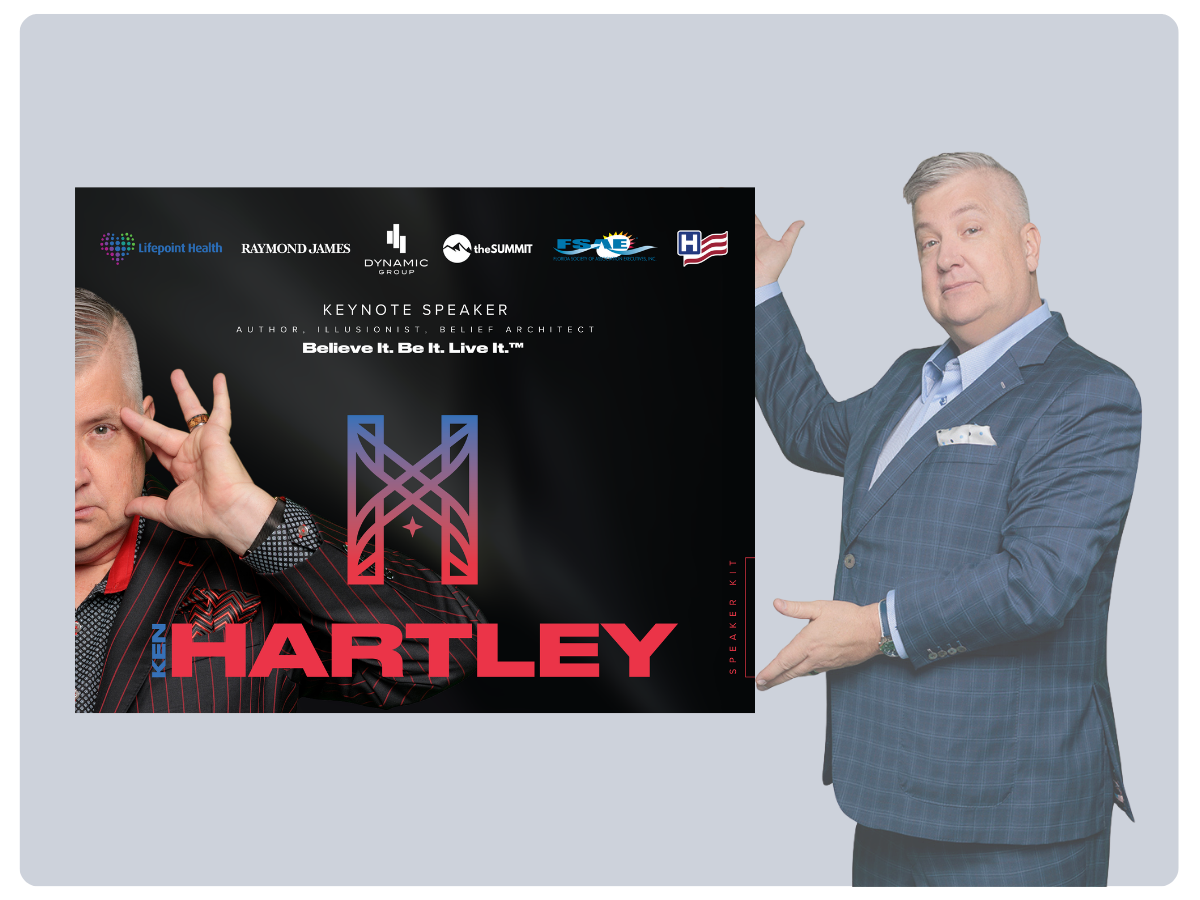 Ken Hartley is a Certified Speaking Professional, bestselling author of 10 books, award-winning illusionist, and Belief Architect who helps leaders break limiting beliefs, communicate with clarity, and lead with confidence. When Ken came to us, he needed more than a visual refresh. He needed a complete brand built from the ground up that could hold the full weight of who he is: speaker, author, mentor, singer, and illusionist, all unified under one compelling identity. We built it all. From logo and brand positioning to copywriting, speaker kit, social assets, book design, and custom keynote presentation design, every touchpoint was crafted to reflect the depth, credibility, and captivating presence Ken brings to every stage. The result is a brand as layered and intentional as Ken himself, one that earns trust before he ever speaks a word and positions him powerfully across every market he serves.
